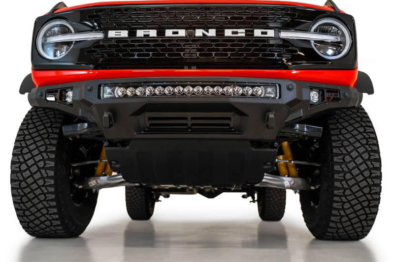 Stealth Fighter Front Bumper ADD Offroad's 2021-2022 Bronco Stealth Fighter Front Bumper was designed for high clearance and style. At the center of the bumper, either a 30-inch radius light bar or up to 8 cube lights can be mounted. Towards either end are mounting points for a single cube light each. It retains the OEM parking sensors, and for models without sensors, we include plugs. The bottom panel has louvers for intercooler airflow. Our Stealth Fighter aluminum alloy front skid plate is available to replace the factory skid. Two reinforced clevis mounts provide recovery options on the trail.