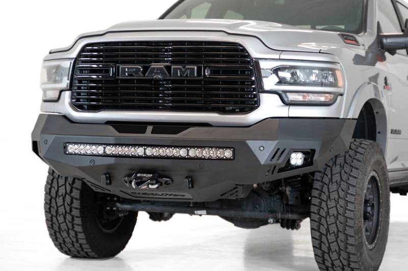 Stealth Fighter Front Bumper Addictive Desert Designs is proud to bring the Stealth Fighter line of bumpers to the 2020 Ram 2500/3500 platform. A radius plate steel design allows the bumper to stay tight to the front of the truck. Our universal light mount system in the center of the bumper allows the use of a 40" radius light bar or up to 10 cube lights. There is an additional cube light mount behind each side panel. Standard cutouts allow this bumper to retain OEM parking sensors. The Stealth Fighter comes standard with a winch mount that bolts directly to the vehicle's frame for greater strength. Access holes in the top of the bumper ensure maximum winch functionality. Our clevis mounts also provide a reinforced mounting point for 3/4" D-rings. As always this product is fully bolt-on and made in America.