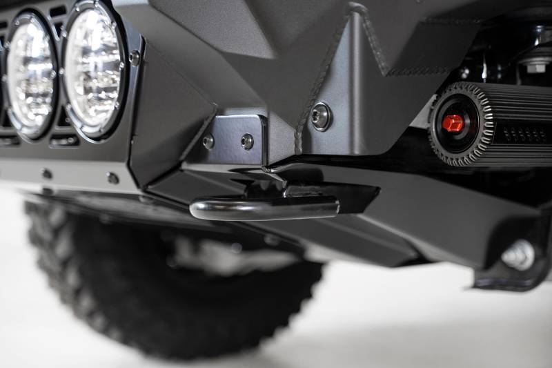 Bomber Front Bumper The Addictive Desert Designs Bomber front bumper for the Ford Raptor is the ultimate combination of form and function. The modern plate steel face of the bumper gives an aggressive styling, while the full 3/16 aluminum skid plate allows the Bomber to be lighter than the OEM bumper. The Bomber is offered in two varieties: with 4 Rigid 360 6" light mounts or 3 Baja Designs LP6 light mounts in the center. Additional cube light mounts on each side of the bumper give even more lighting options. OEM tow hooks are retained for added utility. As always, this bumper is fully bolt-on and made in America.