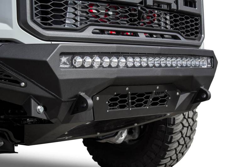 Stealth Fighter Front Bumper Addictive Desert Designs Stealth Fighter front bumper for the 2017 Ford Raptor is one of our tightest fitting and most aggressive looking bumpers on the market. Measuring only 1/2" farther from the grille than the factory bumper the Stealth Fighter gives your Raptor a tight fitting steel plate designed bumper. A modern radius plate design allows the Stealth Fighter to keep a tight fit around the front of your truck to match the factory design, while giving your the added protection of a steel plated bumper. The center of the bumper has a universal light mount system that allows you to mount up to 10 cube lights or a 40" radius or straight LED, or anything in between to give your Ford Raptor the additional lighting setup that you need. Additional mounts for RIGID 10" SR LEDs behind the side panels give your Raptor even more lighting options.