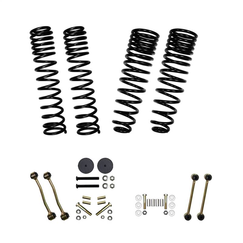 Skyjacker specifically engineered a progressive variable rate coil spring, distinctively a 2-stage dual rate long travel coil. Spring rate progression is from a 1st Flex Rate to a 2nd Ride Rate.The 1st Flex Rate stage delivers a comfortable ride with the ability to flex for increased articulation. The flex rate expands during full articulation as the suspension drops (full droop). This keeps the coil springs seated in the upper coil mount/bucket and the tires in contact with the terrain. The 2nd Ride Rate stage only engages after compression past the flex rate.Engineered to coordinate with the Gladiator's distinctive suspension handling characteristics, the rear coils are side specific. Designed to raise the rear 1 in. to gain a more level stance.Front Bump Stop Spacers bolt onto the axle bump pads and keep the suspension travel safely in check. Front and Rear Extended Length Sway Bar End Links allow full articulation as the suspension drops (full droop). These sway bar end links include Skyjacker installed pressed-in HD OEM style rubber bushings.Proper suspension geometry ensures the Electronic Stability Control (ESC) system functions within factory parameters.