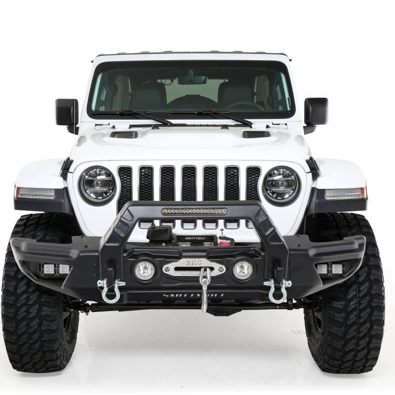 The Smittybilt Stryker Modular Bumper for 2007+ Jeep Wrangler JK/JL and 2020+ Jeep Gladiator JT combines strength, versatility, and modern design for optimal off-roading performance. Made from 3mm cold-rolled steel, its aggressive stubby design provides weight savings while offering full-protection bumper options. Equipped with a bolt-on internal winch plate (accommodating up to 12k lbs), integrated lift points, and 3/4" D-ring mounts, it ensures reliable recovery. The bumper also features a removable overrider for a single row LED light bar, a heavy-duty reinforced skid plate for added protection, and provisions for optional side wings and additional lighting, all backed by a Limited Lifetime Structural Warranty and a 5-Year Finish Warranty.
