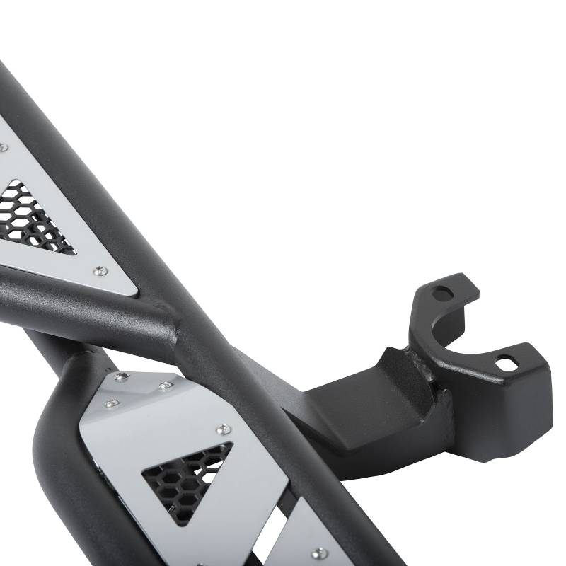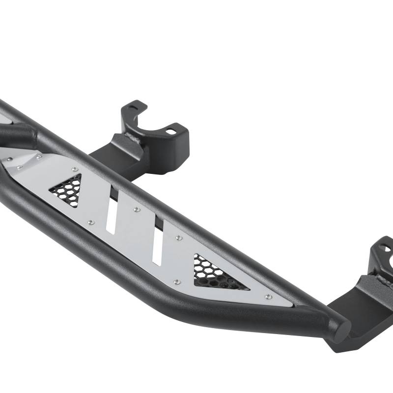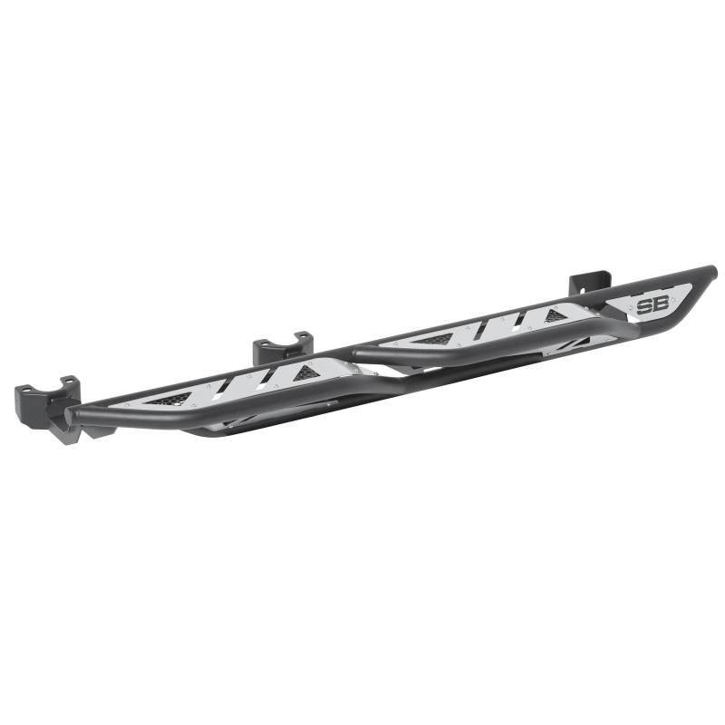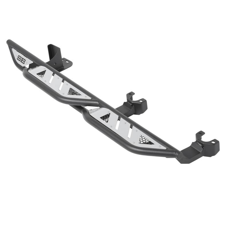 The Smittybilt Apollo Sliders with Step provide exceptional protection and style for your Jeep Wrangler JK/JKU/JL/JLU, Gladiator JT, 4Runner, and Ford Bronco (2 and 4-door models). Crafted from heavy-duty steel tubing, these sliders feature a sleek, modern design with removable sheet metal for easy customization. With wheel-to-wheel coverage and a dual girder system, they safeguard your vehicle's sides and undercarriage while offering a convenient step for easier access.