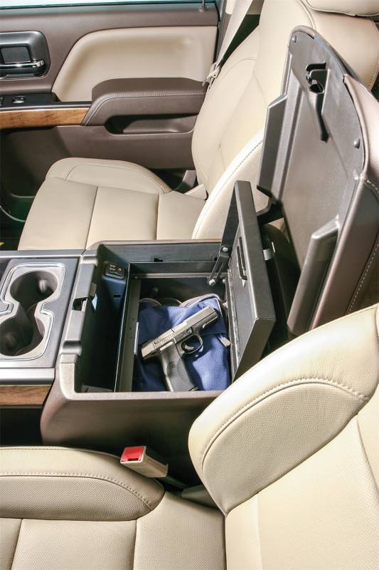 Console Safe | Chevy/GMC Truck/SUV | Standard Key | 2014-2020 Continuing the Tuffy legacy of designing and manufacturing the finest console safes in the industry since 1997, Tuffy is proud to introduce our new line-up of console safes for full size trucks. This 16 gauge steel console safe provides style, security and convenience. While maintaining the refined curves of the OEM console, the Tuffy console safe transforms your OEM console into a heavy-duty lockable storage area utilizing Tuffy’s Pry-Guard locking system with 10 tumbler double bitted security key to help protect valuables from thieves. The Tuffy console safe provides access to optional OEM USB and power outlets from the console. The innovative design utilizes an exclusive lid support feature that keeps the lid open while accessing contents. The safe maintains a completely stock look including full use of armrest and lid. Featuring a durable texture powder coat finish, the safe comes ready to install in just a few minutes without drilling.