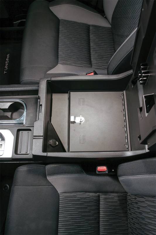 Console Safe | Toyota Tundra | Standard Key | 2014-2021 Continuing the Tuffy legacy of designing and manufacturing the finest console safes in the industry since 1997, Tuffy is proud to introduce our new security console safe for the 2014 plus Toyota Tundra. This 16 gauge steel console safe provides style, security and convenience. While maintaining the refined curves of the OEM console, the Tuffy console safe transforms your OEM console into a heavy-duty lockable storage area utilizing Tuffy’s Pry-Guard locking system with 10 tumbler double bitted security key to help protect valuables from thieves. The Tuffy console safe provides access to optional OEM 12v power outlets from the console. The innovative design utilizes an exclusive lid support feature that keeps the lid open while accessing contents. The safe maintains a completely stock look including full use of armrest and lid. Featuring a durable texture powder coat finish, the safe comes ready to install in just a few minutes without drilling.