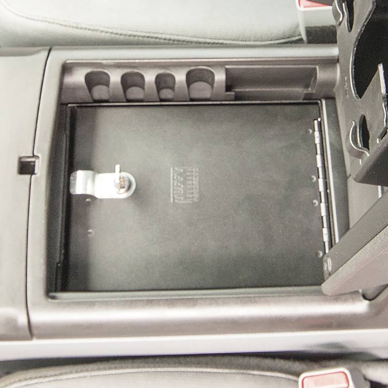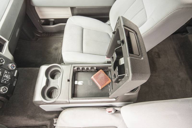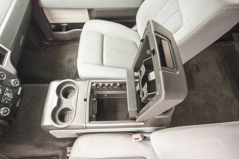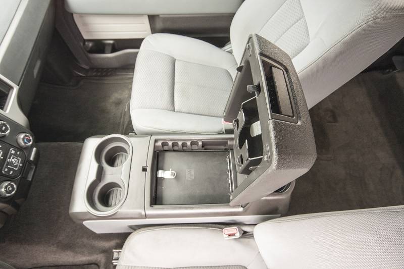 Console Safe | Ford F150 Column Shift | Standard Key | 2009-2014 Continuing the Tuffy legacy of designing and manufacturing the finest console safes in the industry since 1997, Tuffy is proud to introduce our Security Console Insert for the Ford F-150 XLT with full center console and column shift. This 16 gauge steel console safe provides style, security and convenience. While maintaining the refined curves of the OEM console, the Tuffy console safe transforms your OEM console into a heavy-duty lockable storage area utilizing Tuffy’s Pry-Guard locking system with 10 tumbler double bitted security key to help protect valuables from thieves. The Tuffy console safe provides access to optional OEM USB and power outlets inside the console utilizing an exclusive lid support feature that keeps the lid open while accessing contents. It maintains a completely stock look, armrest and lid. Featuring a durable texture powder coat finish, the safe comes ready to install in just a few minutes without drilling.