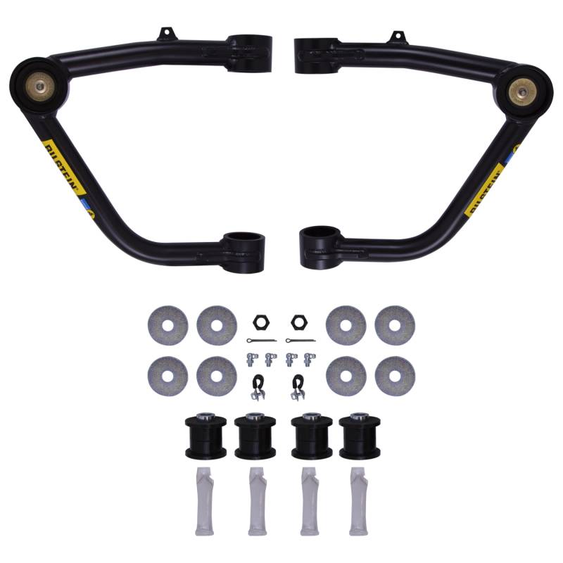 B8 Control Arms - Upper Control Arm Kit B8 Control Arms are a direct fit upgrade for factory upper control arms on trucks and SUVs. The kit contains a pair of control arms which correct the caster alignment for better straight line stability with lifted suspensions, and the improved pivot angles increase wheel travel and reduce stress on the joints. These strong black powder-coated 4130 chromoly steel arms are a tubular design which allows for more spring and shock clearance and feature greasable polyurethane bushings and heavy duty ball joints for the ideal combination of ride quality and durability with minimal maintenance needed. They come with detailed instructions and all necessary hardware for easy installation and are compatible with all Bilstein shocks and coilover kits. All components are replaceable. B8 Control Arms are a direct fit upgrade for factory upper control arms on trucks and SUVs The kit contains a pair of control arms which correct the caster alignment for better straight line stability with lifted suspensions, and the improved pivot angles increase wheel travel and reduce stress on the joints Strong black powder-coated 4130 chromoly steel arms are a tubular design which allows for more spring and shock clearance and feature greasable polyurethane bushings and heavy duty ball joints
