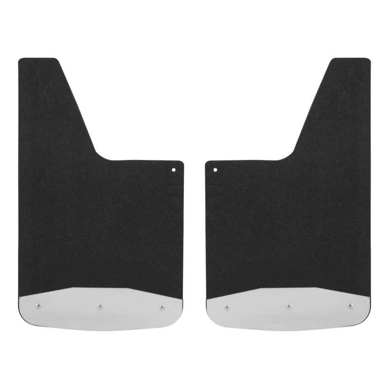 Front 12" x 23" Textured Rubber Mud Guards, Select Ram 1500 (2 Flaps) Whether you're on the job or off-roading through the wilderness, it doesn't take long for rocks and other debris to wreak havoc on the body of your truck. LUVERNE Textured Rubber Mud Guards are the perfect solution for maintaining that pristine, professional look. For the front or rear of the truck, these custom mud flaps add style and body protection. They are constructed from heavy-duty black rubber that stands up to road debris and sheds water with ease. They feature 18-gauge stainless steel plates to help protect the bottom edge and extend the life of the mud flaps. With their 3/8" thick, recycled rubber construction, Textured Rubber Mud Guards easily deflect everything from mud to gravel, protecting the body of your truck from scratches, chips and scuffs. They are also made to add a stylish accent to your truck, featuring stainless steel plates along the bottom edge of each flap. The plates are made from 18-gauge stainless steel to provide a heavy-duty, rust-resistant shield, and they feature a bright, high-polish finish for a long-lasting shine. The textured finish of the rubber mud flaps is also designed to easily hide minor scuffs and scratches and maintain a clean appearance. For an easy installation and a custom fit, these truck mud flaps are made vehicle-specific. This particular set fits specific years of the Ram 1500 (see application info to verify fitment). They install with corrosion-resistant fasteners and high-strength steel mounting brackets with a galvanized finish for long-lasting durability. Universal mud flaps are also available.