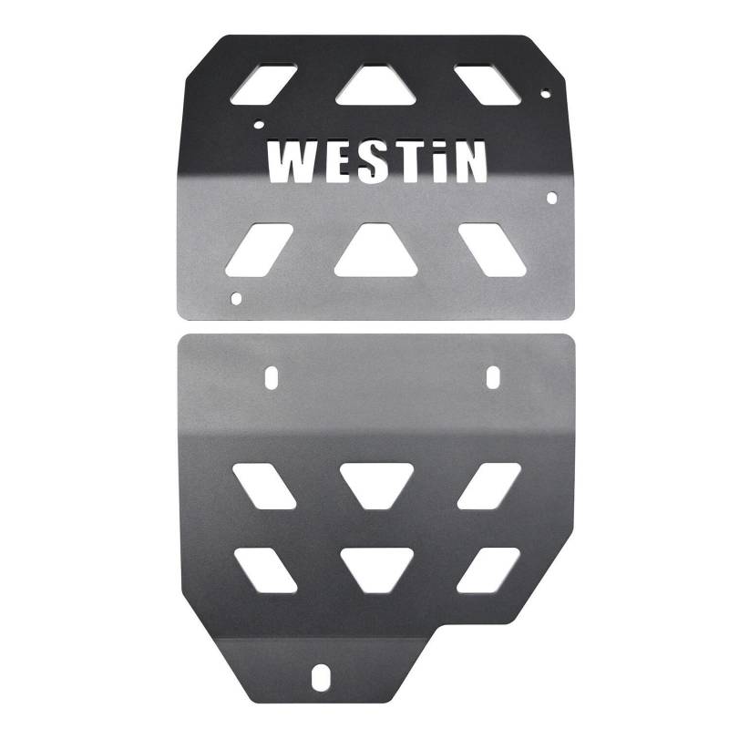 Transmission Pan Skid Plate Westins Transmission Pan Skid Plate is a full length plate that protects the transmission from damage during off-road driving. The 3/16in. plate steel construction features a laser cut logo and other openings that help minimize weight & provide cooling airflow, and has formed edges for maximum strength. Available for 2 door or 4 door Jeep(R) Wrangler. Additional skid plates available (sold separately). Protects your Jeep's undercarriage from off-road hazards Available for 2 and 4 door Jeep Wranglers Steel construction Mounts directly underneath transfer case
