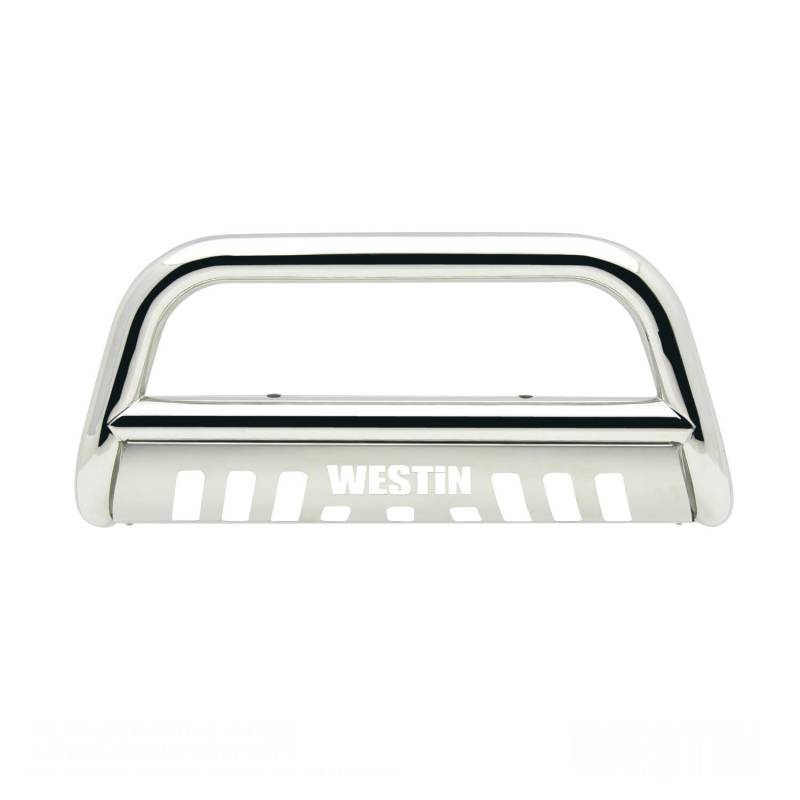 E-Series Bull Bar Westin(TM) E-Series Bull Bars are a front-end light bar designed for trucks and larger model SUVs. It is made of 3 diameter polished stainless steel tube. It mounts utilizing existing vehicle mounting points and installation does not require any drilling to the vehicle frame. Comes complete with mounting kit the Westin(TM) E-Series Bull Bar provides a mounting point for 2 auxiliary lights up to 6 in diameter. It features a die-cut Westin(TM) block logo design on the stainless steel skid plate unique to the Westin(TM) E-Series Bull Bar. Mount kit included Made of 3" diameter stainless steel tubing Stainless bull bar comes with brushed skid plate Black bull bar comes with textured black skid plate Fully welded cross tube