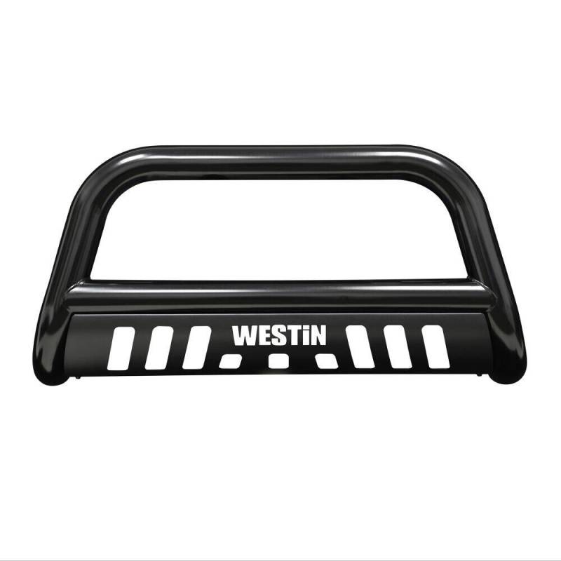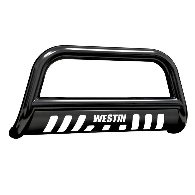 E-Series Bull Bar Westin(TM) E-Series Bull Bars are a front-end light bar designed for trucks and larger model SUVs. It is made of 3 diameter polished stainless steel tube. It mounts utilizing existing vehicle mounting points and installation does not require any drilling to the vehicle frame. Comes complete with mounting kit the Westin(TM) E-Series Bull Bar provides a mounting point for 2 auxiliary lights up to 6 in diameter. It features a die-cut Westin(TM) block logo design on the stainless steel skid plate unique to the Westin(TM) E-Series Bull Bar. Mount kit included Made of 3" diameter stainless steel tubing Stainless bull bar comes with brushed skid plate Black bull bar comes with textured black skid plate Fully welded cross tube