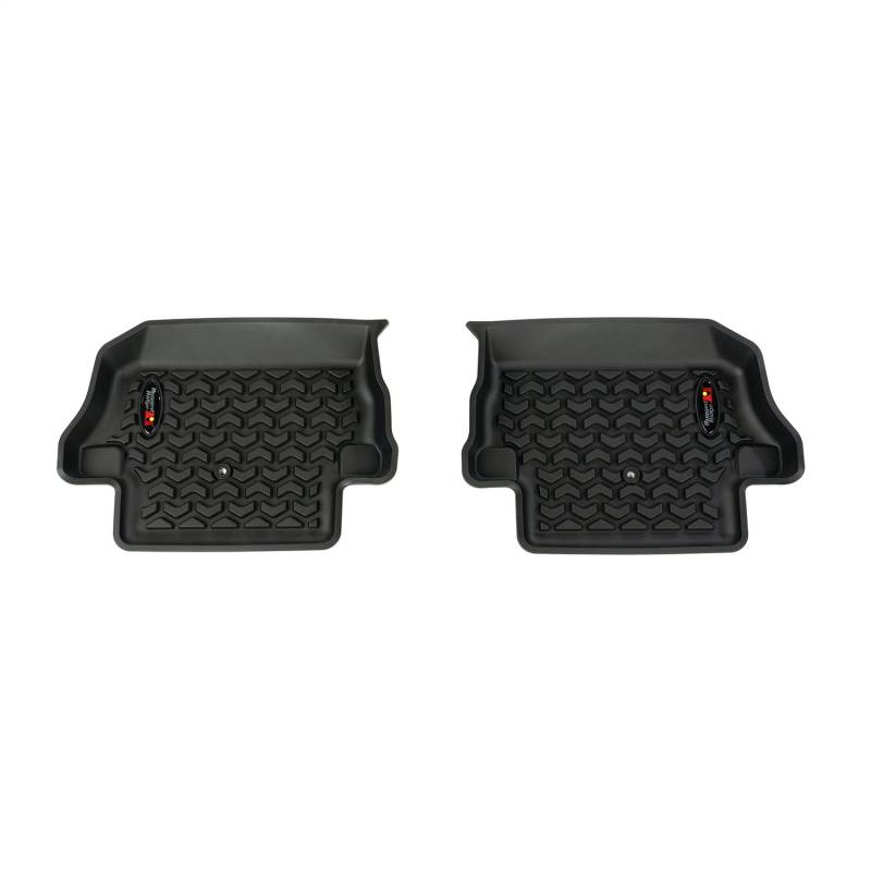 All Terrain Floor Liner Kit, Front/Rear, Black, 18-20 Jeep Wrangler JL, 2 Dr Rugged Ridge Floor liners provide complete protection for the cabin floor of your vehicle while keeping it looking factory fresh. Each liner is injection molded to keep its shape in all temperatures and is perfectly contoured to your vehicle's floor for precise secure fitment (floor hook attachment where applicable). The raised lip captures all spills, water and debris keeping your interior pristine. The Chevron-shape patented Deep Tread Technology channels liquid away from your shoes keeping them dry. Made of a durable OE-quality thermoplastic material that can withstand the rigor of daily abuse. Backed by our Limited Lifetime Warranty. Patent 8,173,369, D627,285