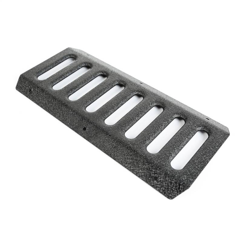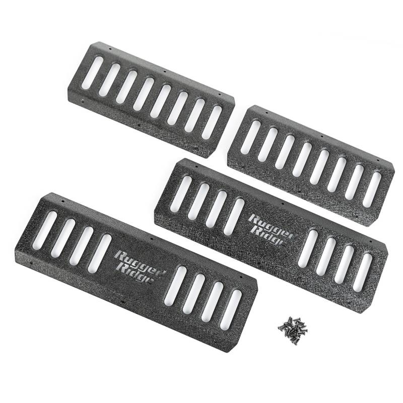 RRC Side Armor Guard Plate Kit; 07-18 Jeep Wrangler JKU RRC Side Armor Guard Plates are the perfect addition for your RRC Side Armor (11504.20). Constructed of tough stamped steel with a sturdy black textured powder coat finish, the Side Armor Guard Plates give a solid platform to assist with vehicle entry that look great and are engineered to last. With stylish recessed vents and a cutout Rugged Ridge logo (fronts only) these guard plates are as good looking as they are functional. Sold as a set of 4.