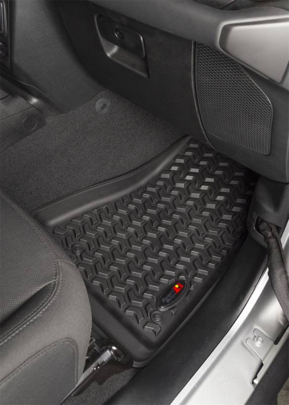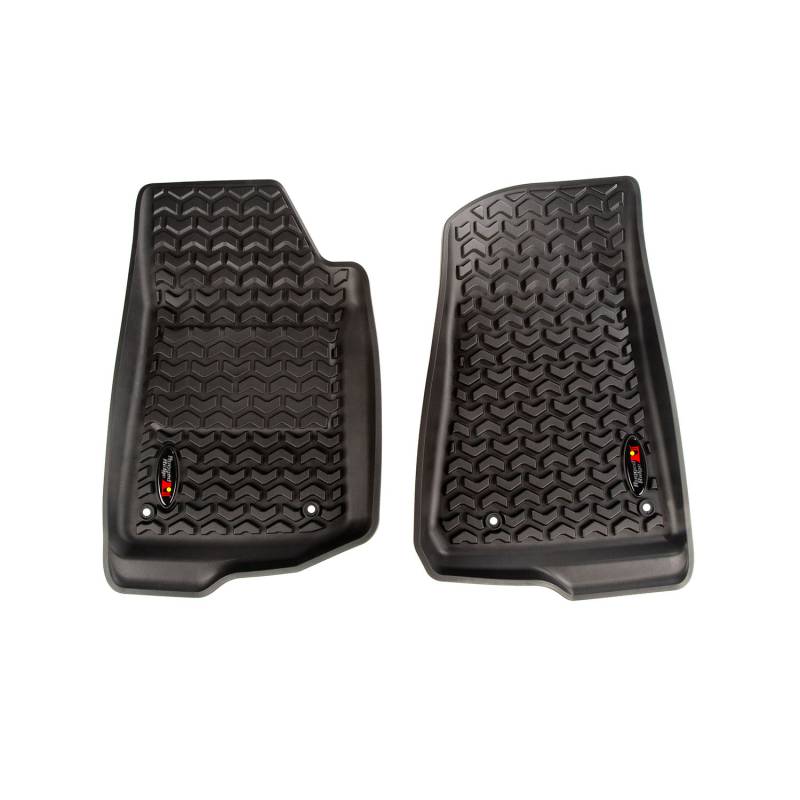 Floor Liner, Front; Black, 2018-2020 Jeep Wrangler, 2020 Gladiator JL / JT Rugged Ridge Floor liners provide complete protection for the cabin floor of your vehicle while keeping it looking factory fresh. Each liner is injection molded to keep it's shape in all temperatures and is perfectly contoured to your vehicle's floor for precise secure fitment (floor hook attachment where applicable). The raised lip captures all spills, water and debris keeping your interior pristine. The Chevron-shape patented Deep Tread Technology channels liquid away from your shoes keeping them dry. Made of a durable OE-quality thermoplastic material that can withstand the rigor of daily abuse. Backed by our Limited Lifetime Warranty. Patent 8,173,369, D627,285