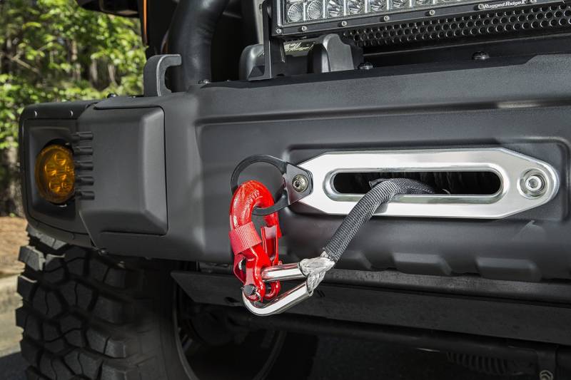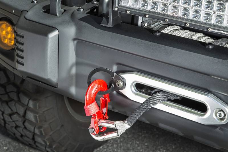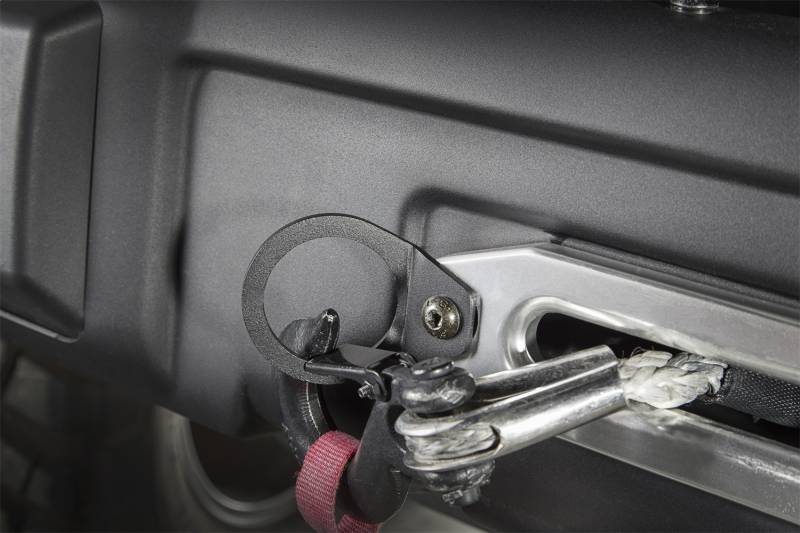 Winch Hook Holder, Universal The Rugged Ridge Winch Hook Holder provides a safe and secure location to store your winch hook when not in use, saving your bumper from dents and scratches. Constructed of stamped stainless steel and finished with a durable black semi-gloss powder coat, the hook secures to both Hawse or roller style fairleads.