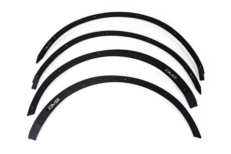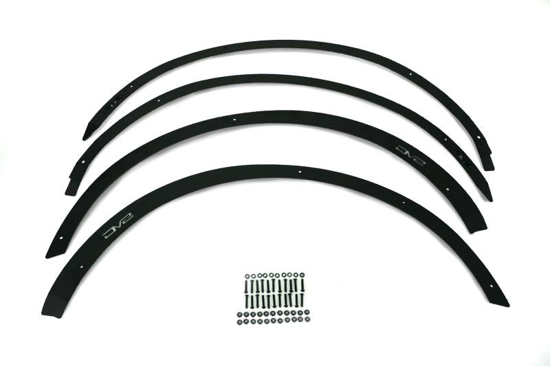 Fender flare deletes for the 2021+ Bronco DV8 Offroad has designed fender flare deletes for the 2021+ Bronco in order to eliminate factory flares & maximize tire clearance. Removing your fender flares increases your distance to obstacles like trees & boulders on the sides of the trail, enabling you to fit in tighter spaces off-road. SET OF 4 FRONT & REAR FENDER DELETES CLEANS UP FENDER PANELS AFTER FLARE REMOVAL LASER-CUT 4MM STEEL MICRO-TEXTURE BLACK POWDER COAT FINISH PAINTABLE ALUMINUM DV8 ACCENT PLATE