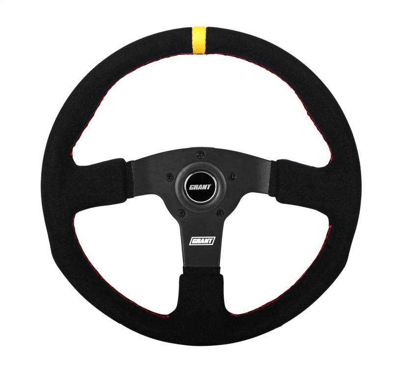 Suede Series Steering Wheel; 13 1/2 in. Diameter; Round Bottom; Black w/Custom Yellow Center Line w/Red Stitching;