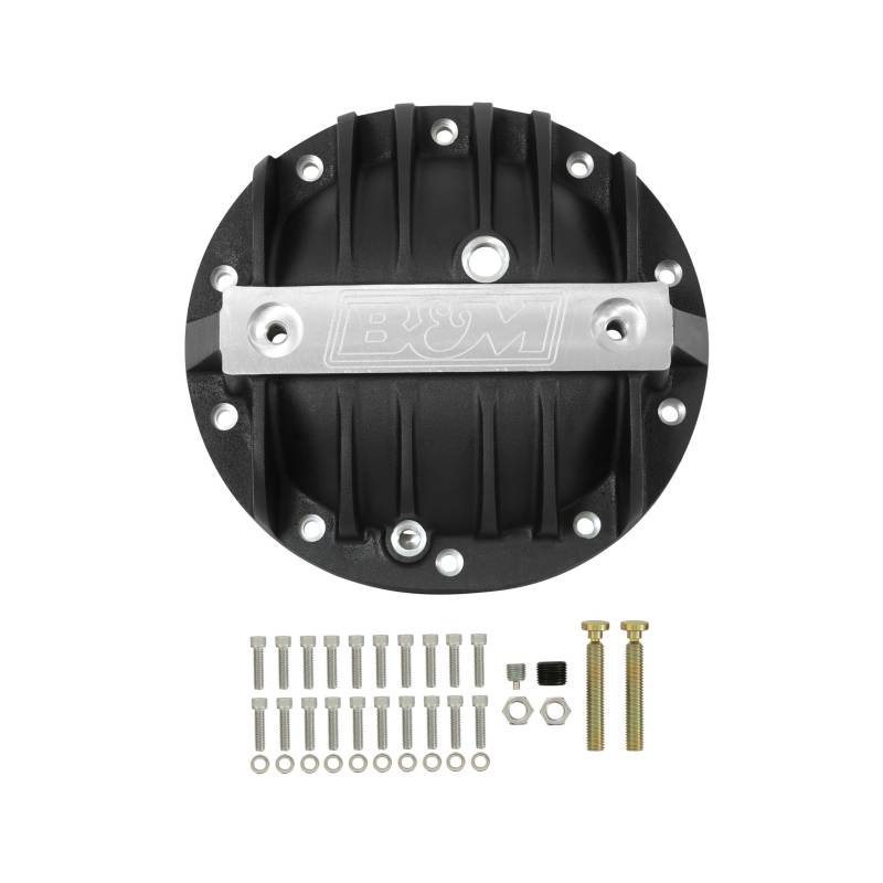 Our engineers designed the line of Hi-Tek differential covers to not only look good but address a number of weaknesses of the factory-stamped steel covers. First, they started by constructing the covers of thick A356.0-T6 aluminum, which dissipates heat much faster than the factory steel unit keeping the fluid temperature lower under high-stress loads vs. a steel cover. Then for added durability, we added a reinforced center bar for extra strength along with load bolts to help prevent bearing cap deflection under severe loads. The internal shape of the cover retains the smooth round back internally to help keep the fluid flow going over the ring gear to properly lubricate the bearings, the ring and pinion gears. Additional features include a magnetic drain plug for catching ferrous metal particles, MIL-Spec (MIL-A-8625) black anodized finish, machined B&M logo, and all necessary hardware and easy-to-follow detailed instructions for a quick and simple installation you can do at home.