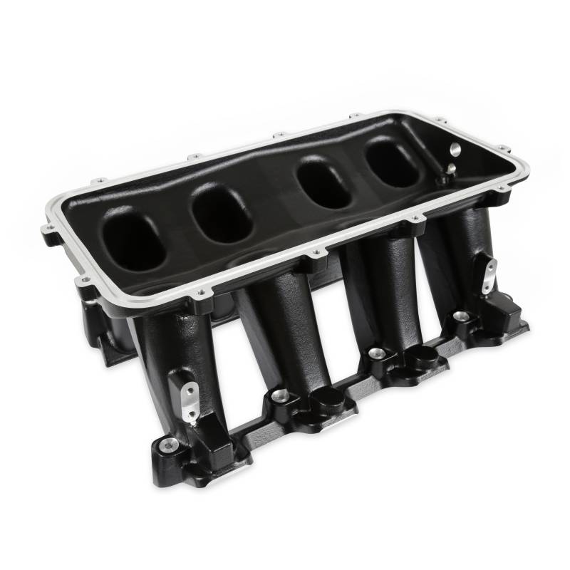 • Intended for use on N/A or forced induction engines in the 6.0 to 7.0+ liter range, max power at 7000-8000+RPM.\n• The base is designed to be modular in configuration to accept a wide range of carbureted and EFI tops and to be attractive to builders and fabricators as the foundation for custom induction systems.\nThe Holley GM LS1/LS2/LS6 Modular Hi-Ram Intake Manifold is introduced as a cost effective alternative to fabricated sheet-metal for high-performance applications where induction system height is not limited. Coupling this Hi-Ram intake with the high flowing LS1/LS2/LS6 style cylinder heads has outstanding potential for N/A and forced induction applications at a budget-minded cost. Aggressive, bold, race-bred styling will make bad intentions clear for drag race, muscle car, marine, off-road, sandrails, pulling trucks, track, street-rod applications and more!\n• Runner length and the tapered cross-section designed to perform well for a wide range of engine configurations\n• Cast aluminum construction.\n• EFI fuel rails are machined for -8AN O-ring Fittings with passages large enough to accommodate high fuel flows and dampen pressure pulsations in the fuel system and come standard with EFI Hi-Ram kits.