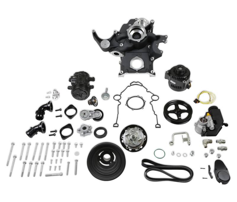Holley's complete, mid-mount accessory system has all accessories pulled in tighter than other accessory drives. At the heart of the system is a "bracketless" design (patent pending), where the accessories bolt directly to the timing cover for a clean, integrated system. The design offers superb engine visibility to show off your horsepower, not your accessories. Among the many swap friendly features are two optional heater connection configurations. The innovative Holley premium alternator incorporates 6-phase and square wire technology. The compact and reliable SD7 A/C compressor and Type II P/S pump with baffled reservoir are also integrated. The kit utilizes Holley's proven cartridge style water pump. When we say "complete", we mean complete. The Mid-Mount system comes with everything you need. All accessories are included; the water pump, A/C compressor, Alternator, P/S pump with reservoir, and the crank damper. All pulleys and the belt are supplied. Even heater hose adapters, power steering to -6 AN hardline, and the alternator plug/harness are included. Easy assembly was a priority during the entire development of this accessory solution. Color graphical instructions walk you through every step of the ultra-easy installation.\nThis accessory drive system fits following Non-VVT Engines:\n2003-2008 5.7L\n2005-2010 6.1L\n2007-2010 392 Mopar Crate Engine