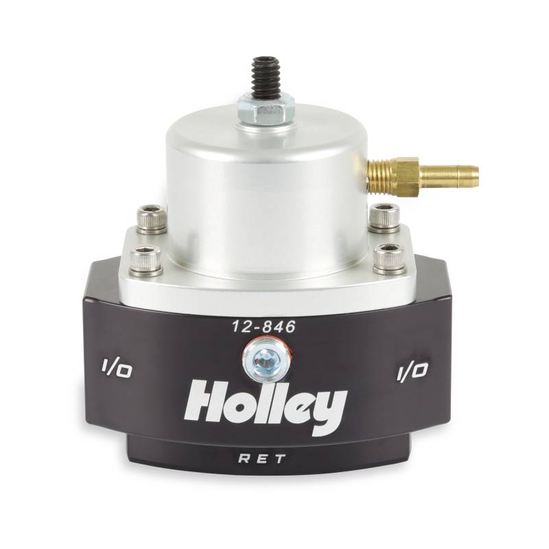 Holley EFI Billet Bypass Style Fuel Pressure Regulator Kits are part of a complete line of fuel system products from Holley. The included 12-846 regulator features a billet aluminum body and a black finish for corrosion resistance and good looks. The regulator contains 8 AN in/out ports, a 6 AN return port, a 1/8" NPT gauge port, and a 1/8" NPT vacuum port for Boost Reference (1:1). In addition, 3 adapter fittings, a barbed fitting for the vacuum port, a mounting bracket, and all necessary hardware are also included.