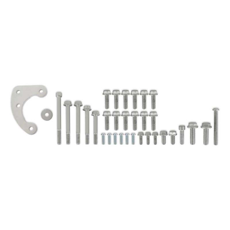 Holley's high-mount accessory drive has everything pulled up and in tighter than other options. The patent pending accessory drive incorporates the timing cover, water pump, and alternator and can also be configured with A/C and/or P/S if desired. This system works with the factory crank pulley, as well as aftermarket damper/pulleys.\nThe accessory drive components in this system can be configured in several different ways. For example, there are alternator options available for different performance and electrical demands. Also, deleting the A/C and/or P/S are options if configured as a custom modular setup. The "base kits" supply all but the components with options. If you purchased a "Holley complete kit," all these options are already chosen for the most common, cost-effective combination.\nThis kit is a service part for part # 97-410 (natural) or 97-418 (black)\nIf you are using an OE pan, see part # 97-408 for the timing cover hardware kit that matches Holley Timing Covers 97-401 (natural) and 97-417 (black).
