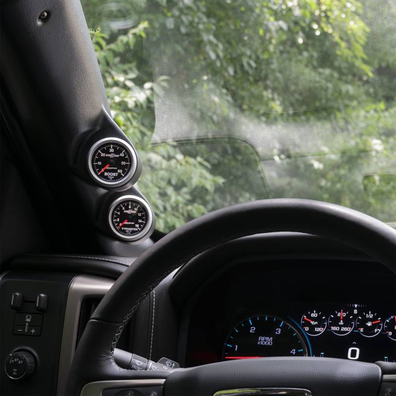 GAUGE MOUNT, A-PILLAR, REPALCEMENT, DUAL, 2 1/16", SILVERADO/SIERRA 14+ Full dual 2-1/16" gauge pillar, black. No handle. Optimally Positions Key Performance Data Within Drivers Field Of Vision Professional fit and finish, no modification of factory trim piece required Black textured finish which can be painted to match your interior if desired High quality, composite construction is incredibly durable and looks great Seamlessly integrate AutoMeter 2-1/16" gauges into your interior
