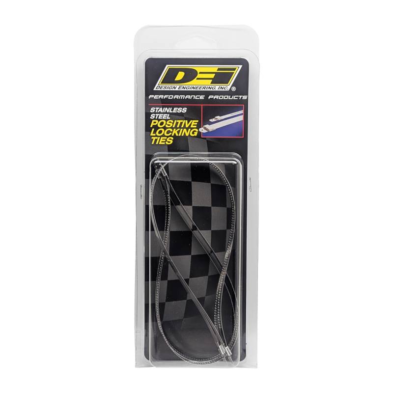 SS Posi Locking Ties 7mm x 14in 4pk Stainless-Steel Positive Locking Ties secure exhaust wrap and solves the problem of needing a locking tie in high heat areas. Stainless-Steel Positive Locking Ties are designed for high heat applications. With it's self-locking design they are great for securing DEI exhaust wrap to pipes or any place a high strength tie is needed. UV and corrosion resistant they will last for many years under severe use. Locking Ties offer many other uses including bundling wires, hoses, and other forms of insulation products. Just slide end into locking mechanism and pull tight. Made from 316 Stainless Steel Tensile Strength: 5/16 in. 200 lbs., 1/2 in. 350 lbs. Capable of wit'standing temperatures in excess of 2500F Fits up to 4 in. O.D. Made From 316 Stainless Steel Tensile Strength 5/16 in. 200 lbs 1/2 in. 350 lbs Capable Of Wit'standing Heat In Excess Of 2500 Degrees F 4 - 7mm x 14in Ties