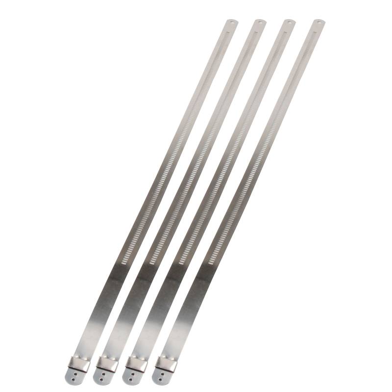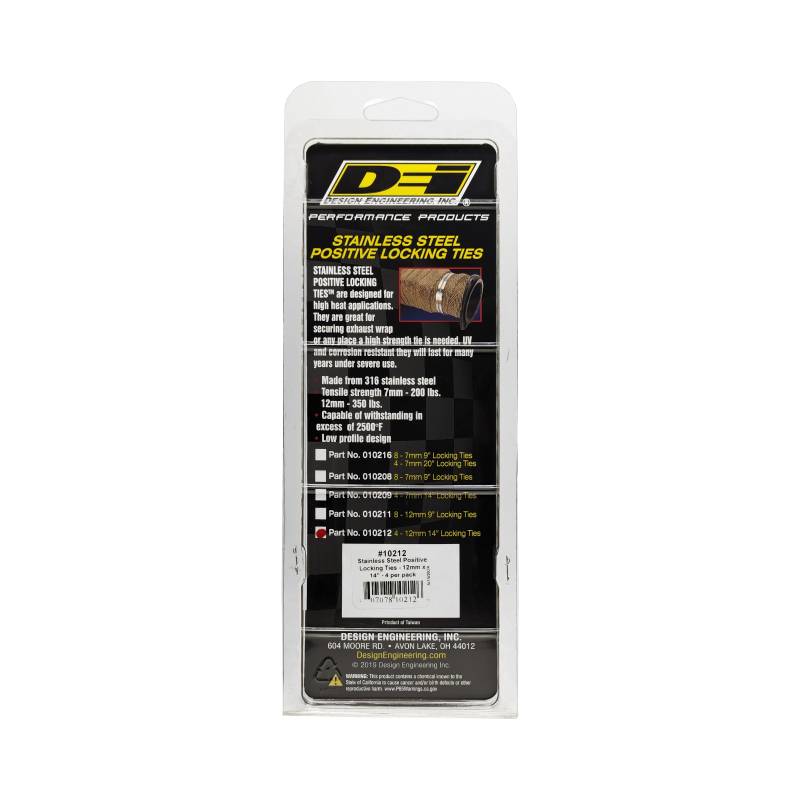 SS Posi Locking Ties 12mm x 14in 4pk Stainless-Steel Positive Locking Ties secure exhaust wrap and solves the problem of needing a locking tie in high heat areas. Stainless-Steel Positive Locking Ties are designed for high heat applications. With it's self-locking design they are great for securing DEI exhaust wrap to pipes or any place a high strength tie is needed. UV and corrosion resistant they will last for many years under severe use. Locking Ties offer many other uses including bundling wires, hoses, and other forms of insulation products. Just slide end into locking mechanism and pull tight. Made from 316 Stainless Steel Tensile Strength: 5/16 in. 200 lbs., 1/2 in. 350 lbs. Capable of wit'standing temperatures in excess of 2500F Fits up to 4 in. O.D. Made From 316 Stainless Steel Tensile Strength 5/16 in. 200 lbs 1/2 in. 350 lbs Capable Of Wit'standing Heat In Excess Of 2500 Degrees F 4 - 12mm -1/2in x 14in Ties