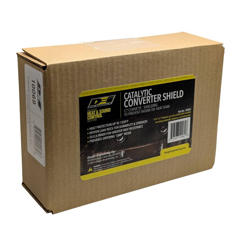 Catalytic Converter Shield Chevy Corvette C7 Chevrolet located the engine oil cooler and oil filter on the C7 Corvette close to the driver side catalytic converter causing heat transfer into the engine oil. Possibly making the ECM send the car into limp mode. By installing our converter heat shield we block this heat transfer and prevent the oil temperature from rising. Dual layer design - Outer layer is hi-temp Titanium Inner layer is 89 percent silica to handle extreme heat Reduce heat soak into oil Easy installation with stainless steel Locking Ties Helps prevent Corvette from going into limp mode from engine oil becoming too hot Size is 14 in. x 6 in. Easy Install/Simple Clamp On With Provided Stainless Clamps Prevents Over Heating Of Engine Oil Prevent The Heat That Triggers ECM Power Reduction
