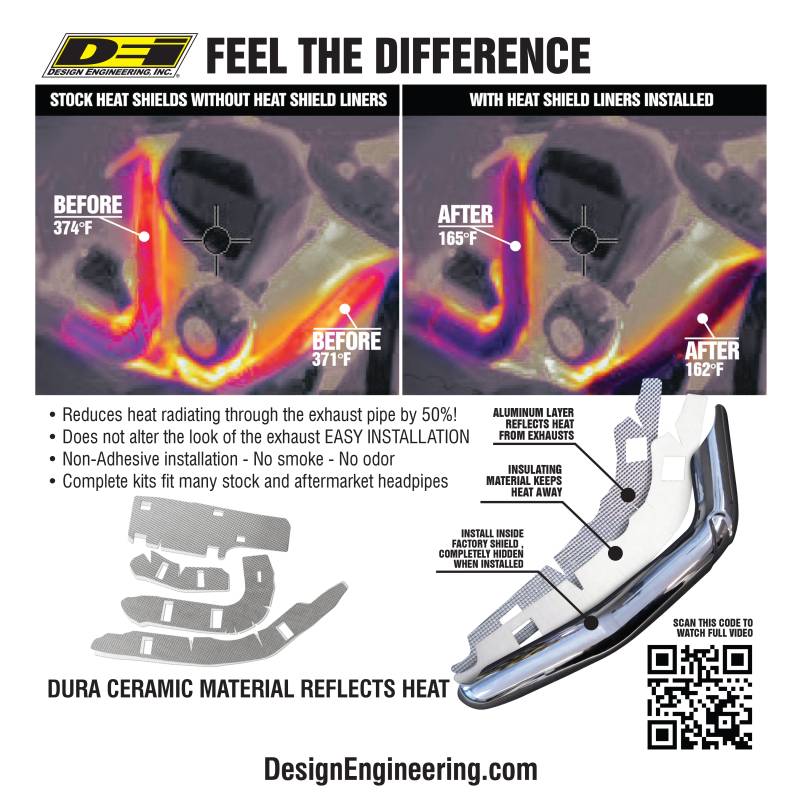 Heat Shield Liner, V&H Power Duals, FLH/FLT/FLR, 2017-2025 Increased riding comfort while maintaining the stock look. Heat from the exhaust system can become uncomfortable, especially riding in slow traffic. This issue really comes into focus for those with shorter legs. Not wanting to disrupt the attractive lines and appearance of the exhaust, DEI's Heat Shield Liner Kit insulates the outer heat shield, without disturbing the looks of the bike. Each piece is precision cut to fit in-between the exhaust pipe and the heat shield, blocking heat transfer and lowering the surface temperatures of the outer shield. Easy to install, with no permanent modifications needed. The Heat Shield Liners are dual layer constructed of Aluminum and our proprietary Dura 2000 insulating material and offer over a 60% reduction in heat. Features CNC cut for a perfect fit Completely hidden when installed Advantages Durable long-lasting materials Simple installation No smoke or odor Benefits Reduces heat radiating from the exhaust system, giving the rider and passenger a cooler ride. This is especially noticeable when the rider stops and puts their feet on the ground. Note: Heat Shield Liners install inside the head pipe heat shields. Please pay attention to what brand head pipe you are running not the brand of the mufflers. Kits are compatible with black or chrome head pipes. Reduces Heat Radiating From The Exhaust System Giving The Rider And Passenger A Cooler Ride This Is Especially Noticeable When The Rider Stops And Puts Their Feet On The Ground CNC Cut For A Perfect Fit Completely Hidden When Installed