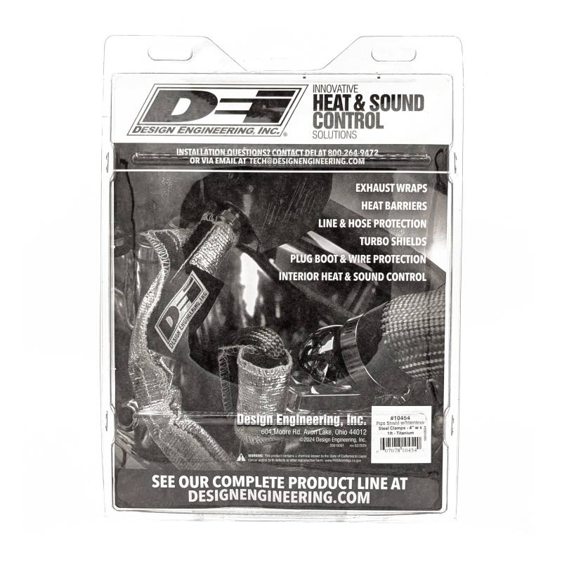 Pipe Shield Titanium 4in x 12in Pipe Shields solve the problem of needing spot heat protection for exhaust pipes and components. Extreme heat can rob power and potentially damage engines, transmissions, hoses, and sensitive electrical components. DEI, a market leader in thermal protection, has introduced a revolutionary advancement in pipe shield technology that greatly outperforms Mylar-backed glass fiber shields. DEI's Titanium Pipe Shield combines the high heat tolerance of DEI's proprietary LR fiber technology with a unique rivet-based clamp shield design to improve heat dissipation and cooling. Glass fiber shields can begin to fail at 900F with the Mylar outer material cracking and flaking off. DEI's Titanium Pipe Shield provides heat protection up to 1350F. LR fiber technology is a two-ply material. The outer layer is made from pulverized and stranded lava rock into a proprietary tightly woven weave for durability and strength. The inside material is made of a special high temperature resistant fabric (89% silica) designed to wit'stand 350 degrees more heat than glass fiber. This proprietary fiber technology combined with DEI's unique shield standoff bracket design provides an air gap between the shield and pipe that together provides the maximum potential for cooling and heat dissipation. With the strategic placement of DEI's Titanium Pipe Shield near transmissions, brake lines, floorboards, body panels, diesel exhaust stacks or motorcycle pipes, radiant heat can be controlled for maximum protection and performance. Other uses include isolated areas such as sections of the exhaust pipe after the collector, an area that can heat transmission fluid, or along the path of an exhaust system in proximity of gas tanks, differentials and rear facias. The shield is designed for multiple automotive applications as well as marine, powersports, diesel and industrial applications where heat dissipation and thermal control is needed. Capable Of Handling High Temperature Exposure Up To 1350 Degrees F Protects Heat Sensitive Components/Hoses/Lines And Wiring Easy To Install With Standoff Brackets And Pipe Clamps Reduces Heat From Entering Vehicle When Placed On Exhaust Pipes Simple To Re-Position