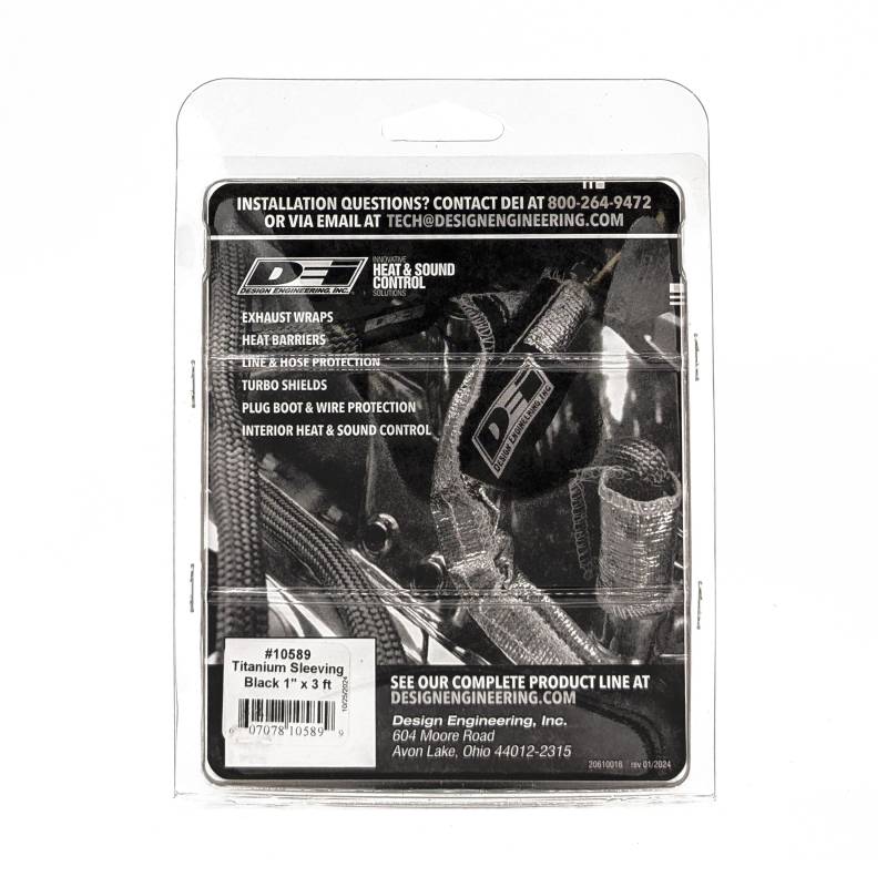 Protect-A-Sleeve Black Titanium 1in x 36in Black Titanium Protect-A-Sleeve solves the problem of burning, cracking plug wires, lines & hoses from engine & exhaust heat, now in a stylish black finish. DEI's Black Titanium Protect-A-Sleeve with LR Technology offers the best possible line sleeve protection on the market. Developed specifically for any application where extreme high heat is present, these Titanium sleeves will protect wires, lines and cables when exposed up to 1800F direct heat/2500F radiant. Developed with DEI's proprietary LR Technology, these high temperature rated sleeves provide superior thermal protection for street vehicles or race engines, protecting fuel, oil lines, spark plug and electrical wires from direct or under hood radiant heat. Water and heat resistant, they are also ideal for Powersports ATV/UTV, motorcycle, personal watercraft, snowmobiles, and marine use. Protects Plug Wires From Hot Exhaust Manifolds And Headers Made From The Same Material As Our Titanium Exhaust Wrap Can Wit'stand Temperatures To 1800 Degrees Chemical And Abrasion Resistant