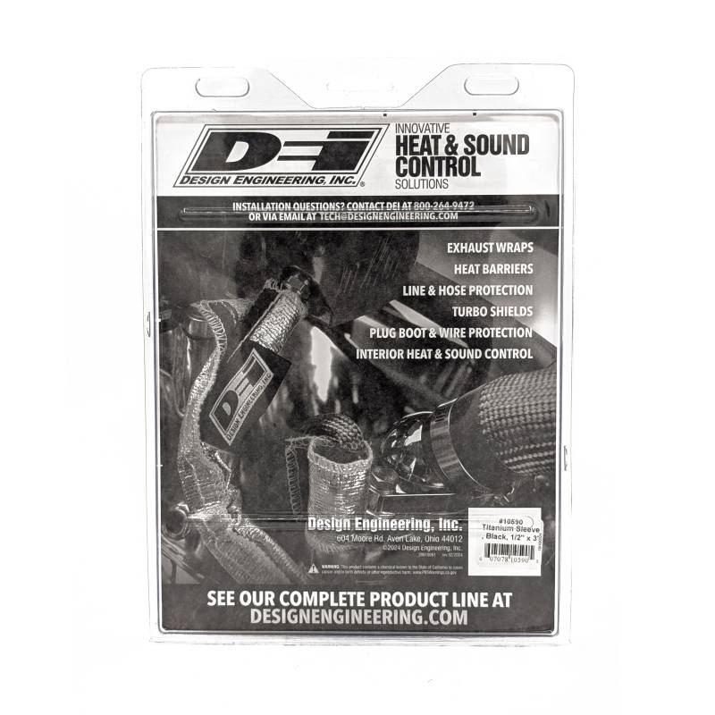 Protect-A-Sleeve Black Titanium .5in x 36in Black Titanium Protect-A-Sleeve solves the problem of burning, cracking plug wires, lines & hoses from engine & exhaust heat, now in a stylish black finish. DEI's Black Titanium Protect-A-Sleeve with LR Technology offers the best possible line sleeve protection on the market. Developed specifically for any application where extreme high heat is present, these Titanium sleeves will protect wires, lines and cables when exposed up to 1800F direct heat/2500F radiant. Developed with DEI's proprietary LR Technology, these high temperature rated sleeves provide superior thermal protection for street vehicles or race engines, protecting fuel, oil lines, spark plug and electrical wires from direct or under hood radiant heat. Water and heat resistant, they are also ideal for Powersports ATV/UTV, motorcycle, personal watercraft, snowmobiles, and marine use. Protects Plug Wires From Hot Exhaust Manifolds And Headers Made From The Same Material As Our Titanium Exhaust Wrap Can Wit'stand Temperatures To 1800 Degrees Chemical And Abrasion Resistant