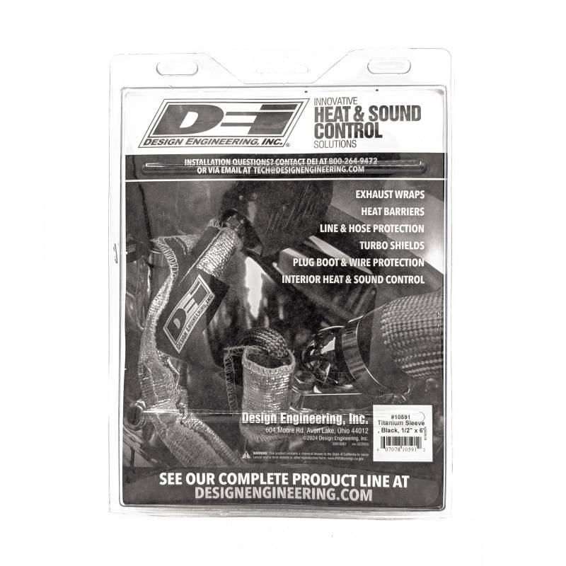 Protect-A-Sleeve Black Titanium .5in x 72in Black Titanium Protect-A-Sleeve solves the problem of burning, cracking plug wires, lines & hoses from engine & exhaust heat, now in a stylish black finish. DEI's Black Titanium Protect-A-Sleeve with LR Technology offers the best possible line sleeve protection on the market. Developed specifically for any application where extreme high heat is present, these Titanium sleeves will protect wires, lines and cables when exposed up to 1800F direct heat/2500F radiant. Developed with DEI's proprietary LR Technology, these high temperature rated sleeves provide superior thermal protection for street vehicles or race engines, protecting fuel, oil lines, spark plug and electrical wires from direct or under hood radiant heat. Water and heat resistant, they are also ideal for Powersports ATV/UTV, motorcycle, personal watercraft, snowmobiles, and marine use. Rich Black Color Includes Heat Shrink Ends Protects Plug Wires From Hot Exhaust Manifolds And Headers Made From The Same Material As Our Titanium Exhaust Wrap Can Wit'stand Temperatures To 1800 Degrees