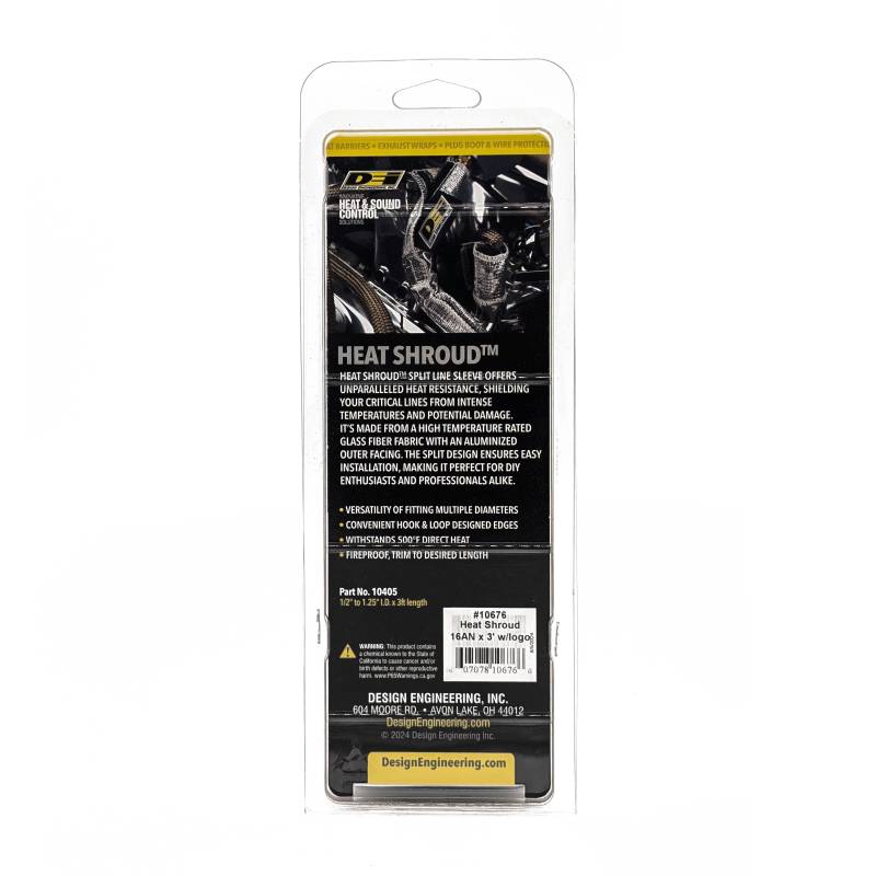 Heat Shroud 16AN x 36in Heat Shroud solves the problem of heat and abrasions causing failure of lines, hoses and wires without the need to disconnect them. Heat Shroud is made from a high temperature rated glass fiber fabric with an aluminized outer facing. Same as Heat Sheath but with the added convenience of hook & loop closure design along the open edges. Without the need of removing one end of connected wires, cables and hoses, simply wrap Heat Shroud around whatever needs protection and close edges. Heat Shroud protects against oil, dirt, road grime and is fireproof, can be shaped to fit the tightest bends and is available in multiple sizes to offer the versatility of fitting diameters from 0.5 - 2.5 inches. No need to remove wires and hoses Convenient hook & loop closure design Available is sizes ranging 0.5 - 2.5 inches in diameter Reflects 90% of radiant heat Easily trim to length DO NOT apply directly to exhaust components. No need to remove wires and hoses Convenient hook & loop closure design Available in sizes ranging 0.5 - 2.5 inches in diameter Reflects 90% of radiant heat Easily trimmed to length