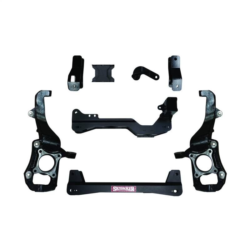 4.5-6 in. Component Box Exacting engineered CNC machined ductile iron replacement steering knuckles preserve the OEM track width and maintain proper steering geometry through the travel cycle. Skyjacker's unique rear crossmember incorporates the driver side sway bar drop bracket for strength and stability. Coupled with a passenger side sway bar drop bracket, the OEM sway bar operates at optimum angles. The pair of sturdy front and rear crossmembers provides a solid mounting point for the OEM lower control arms. Three separate differential relocation brackets reposition and correct front CV axles and driveshaft angles. Every metal fabricated bracket is precise CNC laser cut and precision formed in CNC press break, there is expert workmanship in every component of the kit. Powder coated to provide an extremely durable protective barrier to prevent corrosion. CNC Machined Ductile Iron Knuckles Preserve Oem Track Width Knuckles Keep Same Steering Geometry And Turning Radius Front And Rear Crossmembers Properly Reposition LCA Mount Three Separate Diff Brackets Reposition / Correct CV Angles Differential Brackets Lower And Correct Front Driveshaft Angle