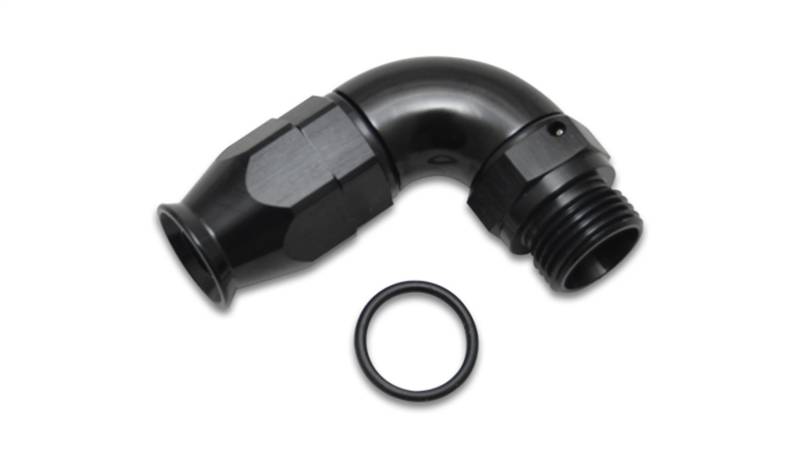 Vibrant Performance 90 Degree High Flow Swivel Hose End Fittings are lightweight and constructed entirely from 6061 Aluminum Alloy. Our 90 Degree High Flow Swivel Hose End Fittings deliver quality, reliability, smooth flow, ease of assembly and the comfort of an anti-leak seal. All Vibrant Performance hose end fittings are available in anodized black only. These Hose Ends are for use with Vibrant PTFE lined flex hoses and include an O-Ring seal.