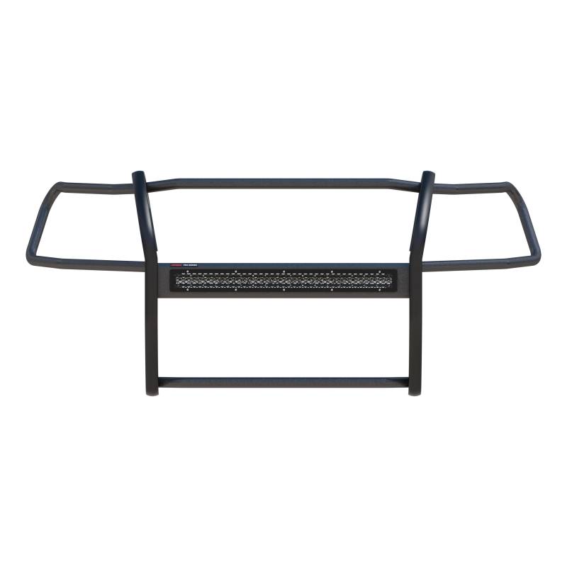 Pro Series Black Steel Grille Guard with Light Bar, Select Ford Ranger The ARIES Pro Series grille guard is unlike any other grille guard or brush guard on the road today because of its patented center crossbar. The ARIES Pro Series grille guard has a unique center crossbar that houses an LED light bar, allowing you to truly set your truck apart from all others. Rather than using a set of light clips or forcing you to drill holes into the frame, the aerodynamic crossbar of the Pro Series grille guard is the light bar housing itself. It uses a 30" slotted channel bracket to mount the included 30" LED light bar #1501264. The bracket can also accept other single-row light bars (some 30" light bars may not fit). The crossbar mount can also articulate, allowing you to position the light beam at any angle you prefer. Integrating the channel mount into the crossbar housing also keeps the light bar protected from the elements. To further stylize your truck, the Pro Series grille guard also comes with an interchangeable grille guard cover plate. Included with each grille guard is a black mesh cover plate that easily bolts on and provides added security for your aftermarket lights. The mesh cover plate can be swapped out with other cover plate options, including five different styles and two finishes. Solid construction should be an essential feature of any grille guard, and the Pro Series grille guard is more than qualified. It has a one-piece design of 1/4" thick welded plates and 1-1/2" mandrel-bent carbon steel tubing. We also finish each Pro Series grille guard in a highly durable, dual-layer E-coat and textured black powder coat, giving it resilience to rust and scratches. This unique finish also helps hide minor scratches and grime to maintain a clean look. ARIES Pro Series grille guards are made vehicle-specific for seamless integration with the factory bumper and an easy, no-drill installation. This grille guard fits select model years of the Ford Ranger (see application info to verify fitment). Patented crossbar houses a single-row LED light bar Interchangeable cover plate protects light bar and offers easy customization Grade-A LED chips offer 14,800-lumen, combo beam pattern Light bar features waterproof aluminum housing and IP68-standard breather Fitted with a strong, waterproof wiring harness for a reliable connection