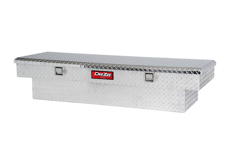Red Label Single Lid Crossover Tool Box Dee Zee Tool Box - Red Label Single Lid Crossover. Constructed of heavy duty Brite-Tread aluminum. Crown style lid with a full pan double-V stiffener for superior rigidity. Other features: lockable stainless steel pull handles, dampened gas shocks, closed cell foam gasket, and self-adjusting strikers. Removable plastic tool tray to help keep small items organized. Non-Rusting Brite-Tread Aluminum Protective Gloss Black Powder coat Finish Lockable Stainless Steel Paddle Handles Internal Bends Add Superior Body Strength Closed Cell Foal Gasket Helps Resist The Elements