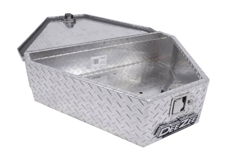 Dee Zee Tool Box - Triangle Tool Box for trailer tongues. Constructed of strong Brite-Tread aluminum with triangle design. Built to mount onto trailer tongues. Features lockable stainless steel paddles handles and gas shocks to assist in opening. Works well for storage wherever you may need it.