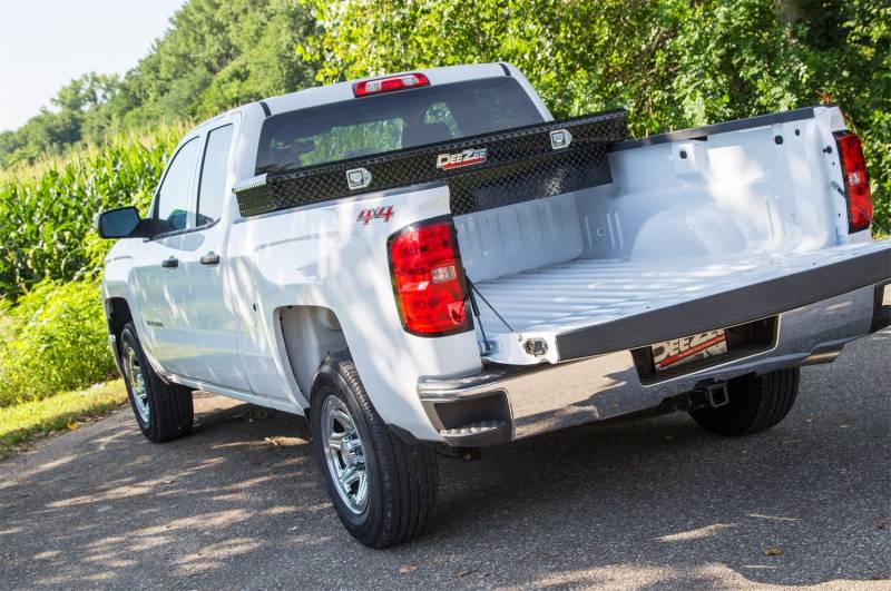 Red Label Single Lid Crossover Tool Box Dee Zee Tool Box - Red Label Single Lid Crossover. Constructed of heavy duty Brite-Tread aluminum. Black-Tread powder coat, provides a gloss black finish while it protects and prevents oxidation. Crown style lid with a full pan double-V stiffener for superior rigidity. Other features: lockable stainless steel paddle handles, dampened gas shocks, closed cell foam gasket, and self-adjusting strikers. Removable plastic tool tray to help keep small items organized. Heavy Duty Brite-Tread Aluminum Black-Tread Powder Coat Gloss Black Finish Crown Style Lid For Superior Rigidity Lockable Stainless Steel Paddle Handles