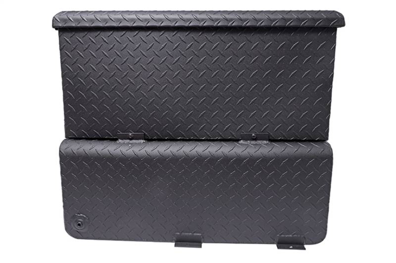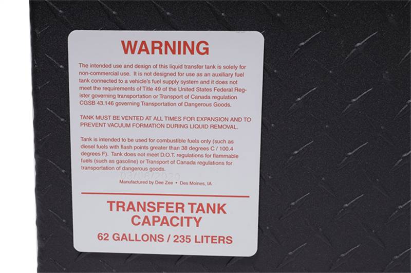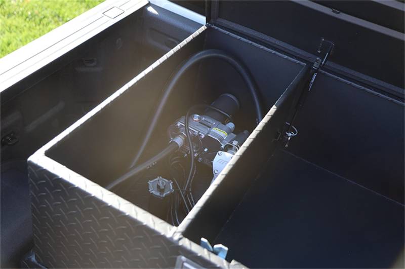 Specialty Series Combo L-Shaped Tool Box/Liquid Transfer Tank Dee Zee Combo Tanks - The convenience of a utility chest connected to a liquid transfer tank. Constructed of heavy duty .125 Brite-Tread aluminum. Radius curve design eliminates key weld pressure points. Aluminum is durable light weight and eliminates the worry of rust. Tanks feature stability baffles, 3/8 in. drainage plug. Tool box offers lockable storage with high quality stainless steel paddle handles and features gas shocks. Coated with NRT(TM) (No Rust Technology) black powder coat for optimal ruggedness and resistance against corrosion.Tanks are intended for private use (non-commercial). Not designed for use as an auxiliary fuel system. Not designed for use as an auxiliary fuel system. Does not meet title 49 of the United Stated Federal Registry governing transportation. Specialty Series Combo L-Shaped Tool Box/Liquid Transfer Tank Constructed Of .125 Brite-Tread Aluminum Radius Curve Eliminates Weld Pressure Points 3 Stability Baffles And Drain Plug Utility Chest Features .056 Brite Tread Aluminum