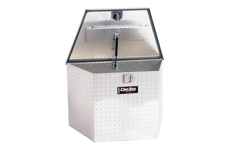 Dee Zee Tool Box - Triangle Tool Box for trailer tongues. Constructed of strong Brite-Tread aluminum with triangle design. Built to mount onto trailer tongues. Features lockable stainless steel paddles handles and gas shocks to assist in opening. Works well for storage wherever you may need it.