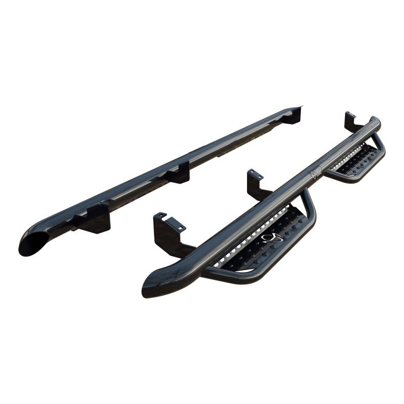 Strong and dependable, Ranch Hand Legend running steps are constructed from 3 in. pipe and 3/16 in. thick brackets for enhanced security to the truck. The steps are frame-mounted in factory locations for easy installation with no drilling required on most models. The front step plates are punched with the official cowboy hat Ranch Hand logo, and all steps have raised steel treads to promote reliable traction when entering or exiting your truck. To maximize safety, Ranch Hand running steps have a vehicle-specific configuration to match the door layout and promote optimal safety and convenience. They feature 1-1/2 in. diameter, drop-down tubes that hold 4 in. wide, 12-gauge punched plates for the perfect platform for stepping into your truck with ease. Each set of steps is finished with a tough, dual-layer A-coat and gloss black powder coating that provides exceptional rust resistance for long-lasting dependability. This particular set of Ranch Hand Legend running steps fits select model years of the Toyota Tundra (see application info to verify fitment).