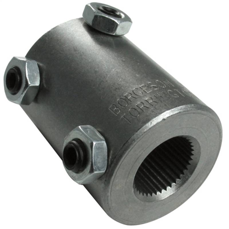 Steering Coupler, Steel, 3/4-36 X 3/4DD Using a 2" straight extension, called a coupler, to extend the steering box, R&P shaft or the column shaft, can sometimes eliminate a universal joint. The coupler can be welded or pinned to the un-splined end of a shaft. The 1"- 48 and 1" DD couplers have a 1-1?4" hole that will accept either an adapter to reduce inside diameter to 3/4" smooth or another splined or 3/4" DD coupler. The coupler assembly would have to be pinned and/or welded together. Welding the coupler is acceptable because there are no moving parts to damage, and the coupler's steel is less susceptible to heat damage from welding. Couplers are available in the same spline and Double D sizes as our universal joints. Couplers and adapters are available in steel and stainless steel only. Smaller diameter than a universal joint. Rigid steel couplings do not count as a pivot point. Joins two shafts to create an extension. Safe to weld. Precision machined from solid billet steel. Made in the USA.
