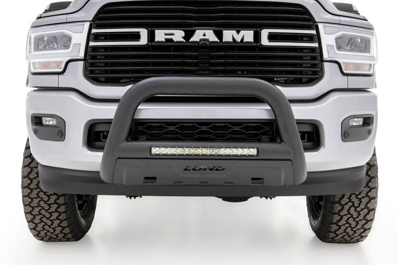 Protects your front end from flying debris with 3.5 inches of oval steel tubing. These bull bars also boost your visibility with an integrated 20 in. LED light bar. The included heavy duty light bar illuminates your night driving with a bright flood beam pattern and is easily wired into your factory light wiring, or a wiring harness can be purchased separately. Available in black textured powder coat or polished T304 stainless steel finish. Our popular LUND bull bars may now be ordered with a wire harness kit. The wire harness kit is also sold separately for lighting and accessories up to 30 Amps. LUND's bull bars with LED light bar and wiring kit is the total package to see and be seen, providing complete front end style, lighting and protection.