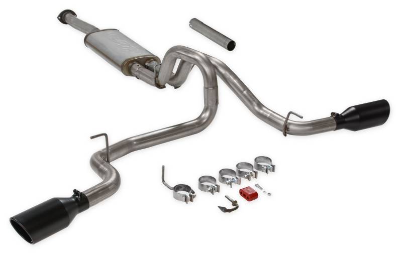 Our new Flowmaster® Flow FX® cat-back exhaust system for all 2016-2023 Toyota Tacoma trucks with the 3.5L engine is manufactured using durable 409 stainless steel throughout and features a 2.50-inch inlet pipe leading to a single inlet/dual outlet Flow FX "straight-through" muffler for great sound and maximum performance. The dual 2.50-inch mandrel-bent stainless steel tailpipes exit out each side at an angle behind the rear wheels directing exhaust away from your boat or travel trailer when towing. The system is finished off with a pair of large 4.50-inch diameter black ceramic coated 304S stainless steel tips, giving your truck a custom look that goes hand in hand with that deep performance Flow FX sound. The system uses all the existing factory hanger locations and includes an additional hanger to install the new left side tailpipe. Includes installation instructions and all necessary hardware for an easy installation that you can do at home. Notes: Fits 2/4 Wheel Drive and all Wheelbases.