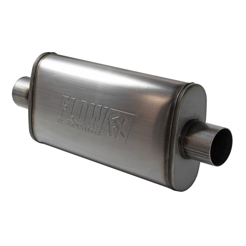 Flowmaster's Flow FX series mufflers deliver a moderate performance tone for the enthusiast looking for an exhaust note that is different from the "chambered" muffler sound. The interior features a large 3.00-inch "straight-through" stainless steel perforated core, surrounded with high-temperature sound absorption materials delivering a deep traditional mellow tone. The internal flow design is reversible, so the muffler can be installed in either direction to best suit the vehicle application and offsets needed. Features include fully MIG-welded "bright" 409 stainless steel construction with the Flow FX logo embossed on both sides of the case. The Flow FX line of mufflers is perfect for the person looking for a show quality performance muffler at an economical price point and in a compact sized case.