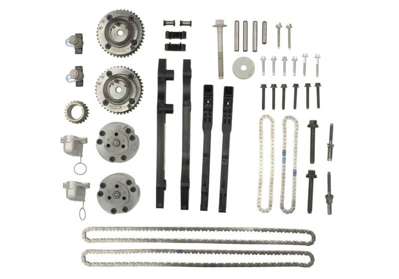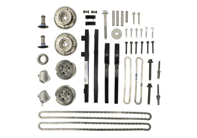 2018-2023 5.0L 4V TI-VCT Mustang Coyote Camshaft Drive Kit Camshaft Drive Kit Incl. New Production Tensioner Arms Chain Guides Incl. New Production Primary And Secondary Timing Chains Incl. Primary and Secondary Timing Chain Tensioners Incl. New Production Camshaft VCT Phasers And Bolts Incl. New Production Forged Steel Crankshaft Sprocket